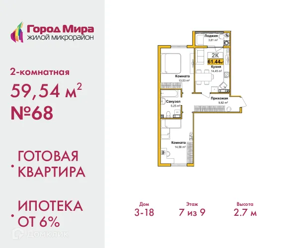 2 комн. квартира в Симферополе в ипотеку от 61 943 руб/месяц